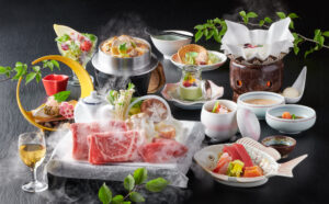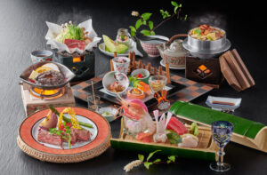 仙台黒毛和牛や三陸の海の幸、旬の山菜や野菜を贅沢に盛り込んでいます。